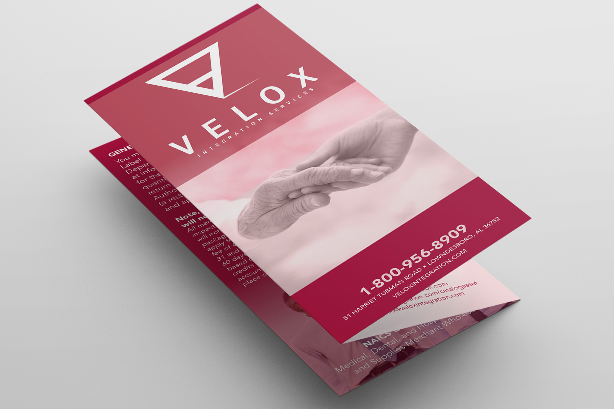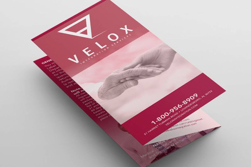 Tri-fold brochure for Velox Integreation Services, a medical supply and assistance organization, Montgomery, AL